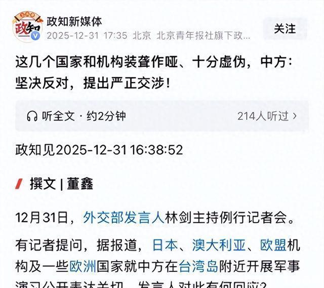 2025年的临了一天,咱们军方晓喻如故成功完成围台军演,然而这场军演带给国外社会的影响不能小觑。 在军演的这几天,总共西方社会,包括好意思国、日本、欧洲、澳大利亚等集体对中国抒发活气,以为军演影响了地区的安全步地。咱们对此抗议,责骂他们给台独传递失实信息。 韩国和一些东南亚的邻国,天然莫得西方国度那么垂危慈祥利地月旦,但他们公开抒发了但愿看到地区和平安固的真义。换句话说,他们对中方的围台军演也有宗旨。