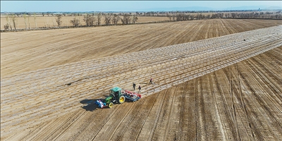 图为4月6日,在呼图壁县五工台镇龙王庙村幸运飞艇app,农机手驾驶搭载北斗导航系统的精量播撒机开展棉花播撒功课。