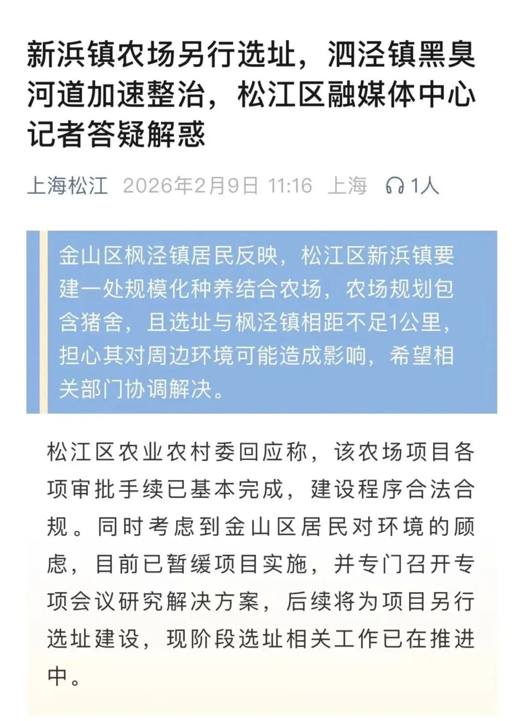 松江区农业农村委复兴称,该农场样式各项审批手续已基本完成,诞生形势正当合规。同期探求到金山区住户对环境的畏怯,现在已暂缓样式抓行,幸运飞艇并专诚召开专项会议缱绻料理决议,后续将为样式另行选址诞生,现阶段,选址有关责任已在鞭策中。